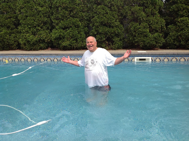 The "early April" weather we've been having for the past six weeks seems to finally be going away. The pool was opened last week and today, with the water at 69 degrees and the air in the mid-70s, it was time to take the First Dunk of the season.